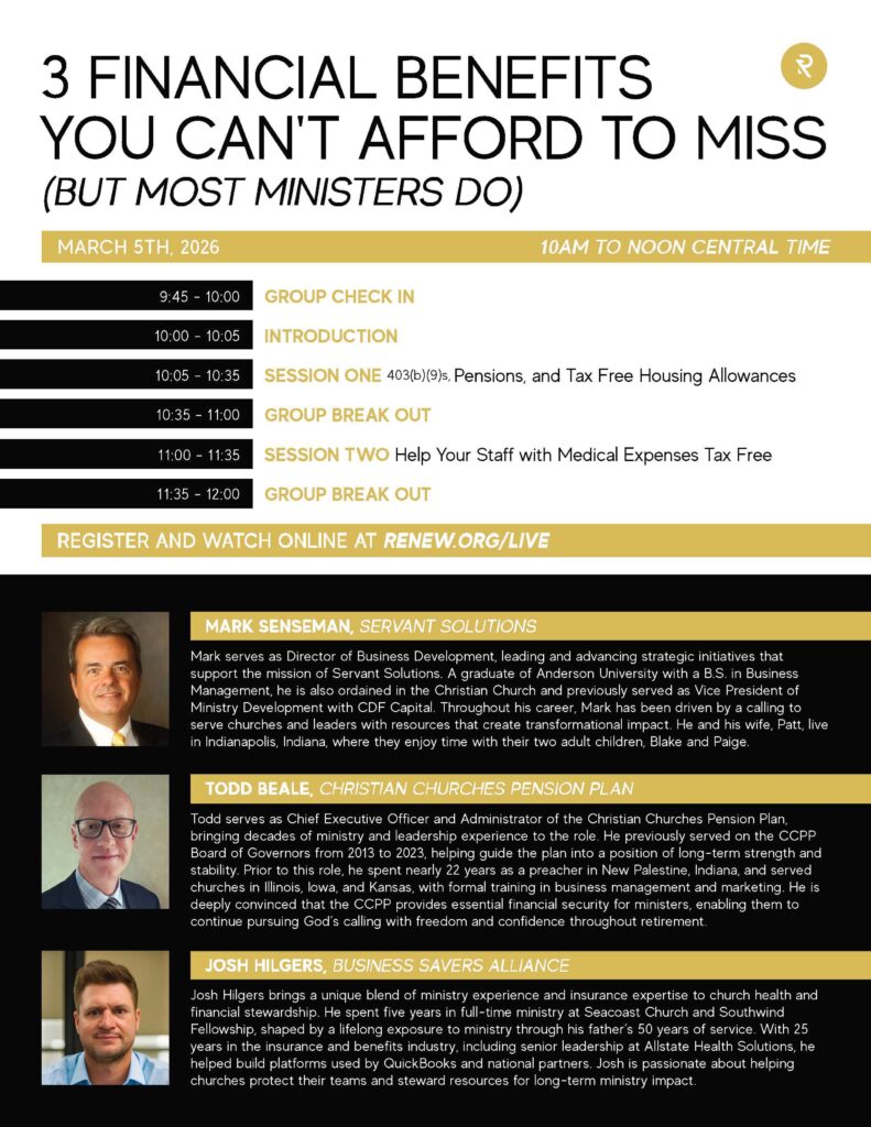 RENEW.org Learning Community for Senior Church Leaders Presents, 3 Financial Benefits You Can’t Afford to Miss with Mark Senseman, Todd Beale, and Josh Hilgers, hosted by RENEW.org